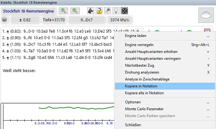Dies kann man erreichen, indem man einfach auf den Zug in der gewünschten Variante geht. Macht man dort nur einen „Mouseover“, wird die Stellung auf dem Analysebrett angezeigt. Klickt man mit links auf denselben Zug, wird die Variante bis zu diesem Zug in die Notation eingefügt.