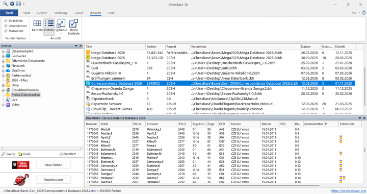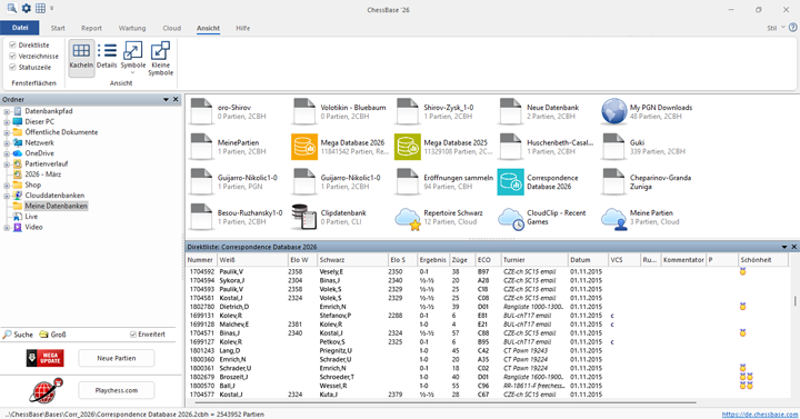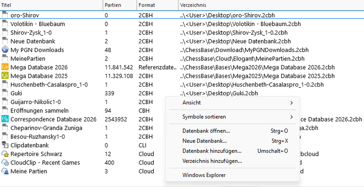 Wichtig für den täglichen Gebrauch von ChessBase´26 ist die praktische Organisation aller Ordner, Datenbanken und Ansichten. Sie werden bei regelmäßigem Gebrauch schnell merken, dass der virtuelle Ordner schnell vollläuft und damit unübersichtlich wird.