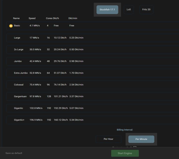 Zu den angebotenen Engines gehören Stockfish, LC0 und Fritz, wodurch Sie Zugriff auf die angesehensten Engines erhalten.