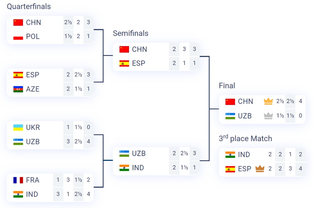 26.11.2022 – Die FIDE-Mannschaftsweltmeisterschaft in Jerusalem ist am Freitag mit dem Sieg der chinesischen Mannschaft zu Ende gegangen, nachdem diese die beiden Finalmatches gegen Usbekistan jeweils mit 2,5:1,5 für sich entschieden hatte. Bronze ging an Spanien, das sich im Spiel um Platz drei, nach zunächst zweimal 2:2, im Tiebreak gegen Indien durchsetzen konnte. | Fotos: Mark Livshitz