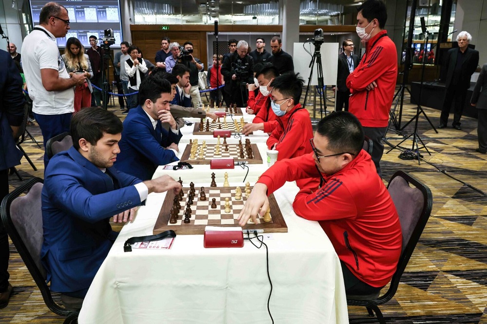Im ersten Match gewann China, bei drei Remisen, die Partie an Brett drei, in der es einige interessante Phasen mit materiellem Ungleichgewicht zu sehen gab - bevor schließlich die nicht mehr gegebene schwarze Königssicherheit den Ausschlag geben sollte: