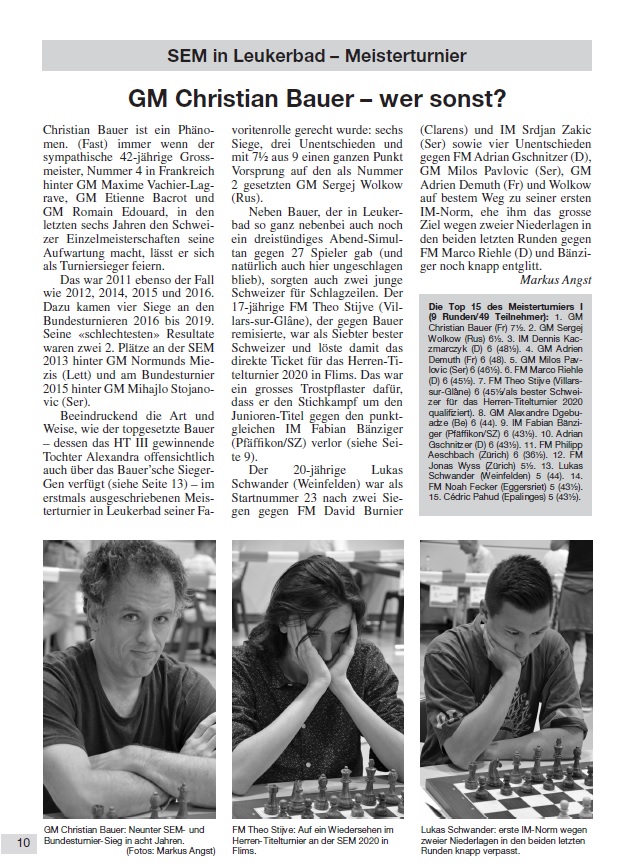 Interessante biographische Details zu Christian Bauer offenbart ein Artikel, der in der neuesten Ausgabe der "Schweizerischen Schachzeitung" erschienen ist, und den wir an dieser Stelle - mit freundlicher Genehmigung des Autors Markus Angst - wiedergeben: