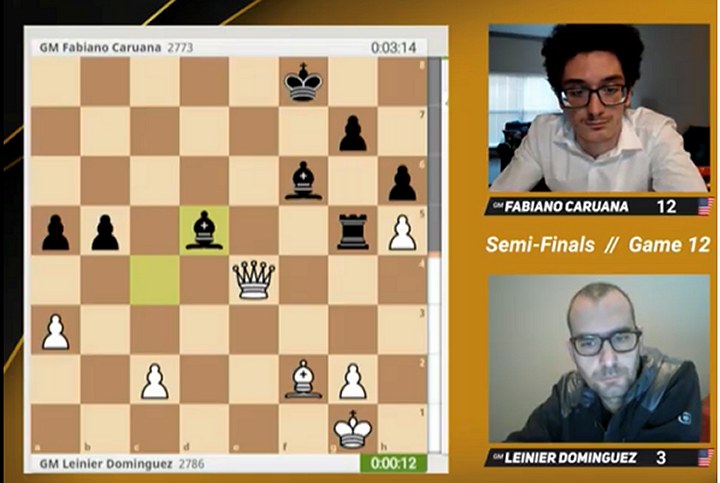Eine andere Dynamik hatte das zweite Halbfinale zwischen Fabiano Caruana und Leinier Dominguez. Am ersten Spieltag hatte sich Caruana hochüberlegen gezeigt und am zweiten Tag setzte er diese Serie fort. Immerhin konnte Dominguez diesmal eine Partie gewinnen. Die beiden Dreipunkte-Partien gingen allerdings an Caruana, der am Ende 15:3 gewann. Da die erzielten Punkte extra prämiert werden, durfte sich das Sparschwein von Caruana freuen.