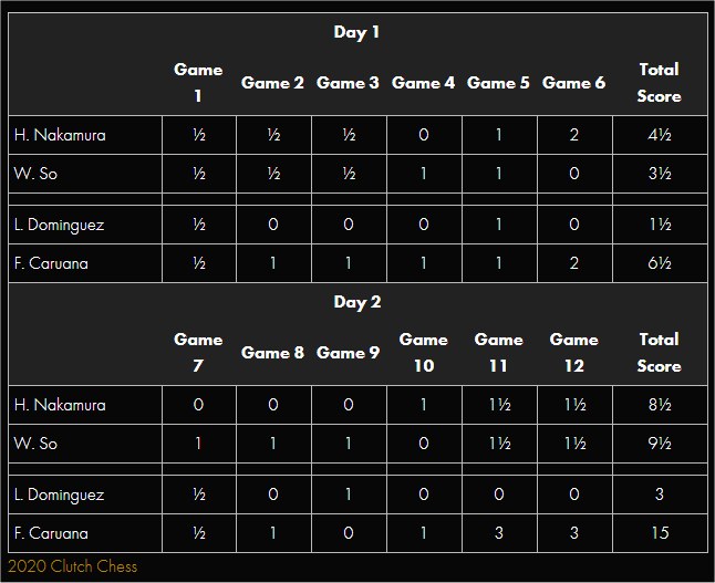 Er kam also mit einer kleinen Führung von einem Punkt zum zweiten Spieltag. Wesley So hatte hier dann aber den deutlich besseren Start und legte gleich zu Anfang eine Serie von drei Siegen hin. Damit hatte er sich einen Vorsprung von zwei Punkten herausgespielt, den Nakamura nicht mehr egalisieren konnte. Nakamura gewann noch die 10. Partie, die aber auch nur einfach gewertet wurde. Partie 11 und 12 wurden in der St. Louis-Clutch-Zählung dreifach gewertet, doch da die Partien beide Remis endeten, konnte keiner der Spieler daraus einen Nutzen ziehen.
