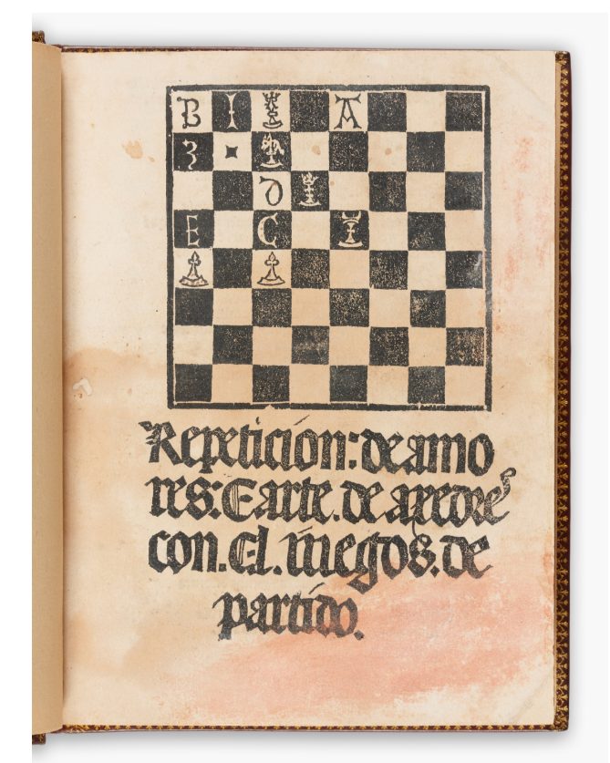 Ein seltenes Exemplar des ältesten erhaltenen Buches über die Praxis des Schachspiels, das 150 Stellungen enthält (allerdings nicht die Lucena-Verteidigung oder die Lucena-Stellung). Lucenas Buch ist besonders bedeutsam, da es unmittelbar nach der Entstehung der modernen Schachregeln in Valencia in den 1470er Jahren verfasst wurde. Die bedeutendste Änderung bestand darin, dass die Dame wesentlich mächtiger wurde als in früheren Versionen des Spiels; das neue Spiel war viel dynamischer und aggressiver und erhielt daher in Italien den Namen scacchi alla rabioso. Lucena beschreibt in seinem Buch sowohl das alte als auch das neue Schach.