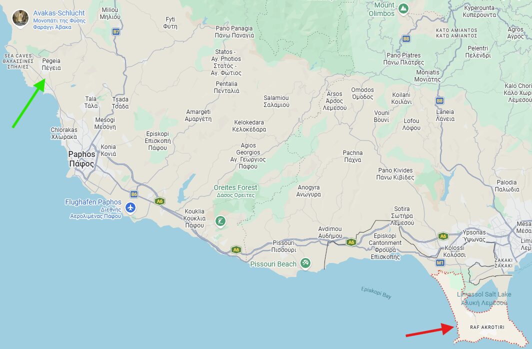 Zwischen dem Flugplatz der britischen Luftwaffe (roter Pfeil) und dem Spielort St. Georges (grüner Pfeil) ist die Entfernung mit dem Auto laut Google Maps (Karte) etwa 80 Kilometer. Luftlinie ist es etwas weniger.