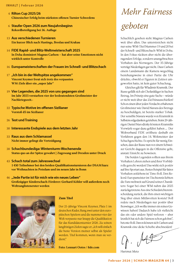 Das gerade erschienene Februar-Heft des Schach-Magazin 64 hat außerdem eine Turnierrundschau mit den Open um den Jahreswechsel sowie viele weitere Themen in petto: