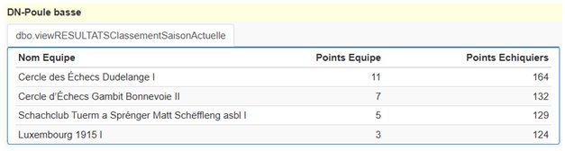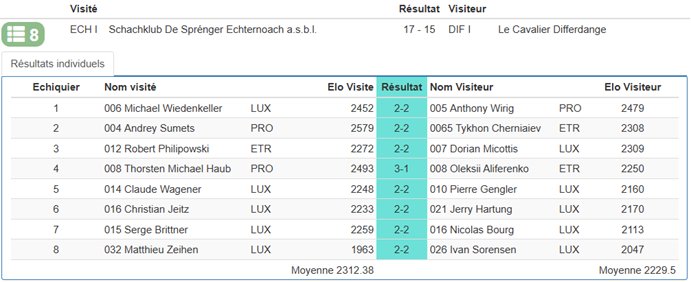 Ich kann mich nicht an eine erfolgreichere Meisterschaftssaison des Echternacher Clubs mit solcher Dominanz erinnern. Top-Scorer mit 7 aus 10 war Vereinsvorsitzender FM Serge Brittner (trotz einer Verlustpartie). FM Claude Wagener und FM Robert Phillipowski steuerten jeweils 6,5 Punkte bei und das prozentual beste Ergebnis erzielte FM Danijel Gibicar mit beeindruckenden 5 aus 5. Anders als in den Vorjahren bot die zentrale Schlussrunde an einem Ort leider keinerlei Spannung, da nicht nur der Meister bereits vor Rundenbeginn feststand sondern auch die beiden Absteiger.