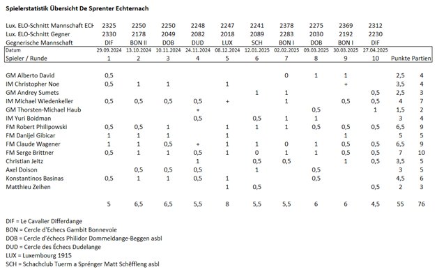 Der Seriensieger und 12-fache Landesmeister aus der Abteistadt Echternach mit dem Springer im Namen hatte in der ersten Runde zum Saisonauftakt gegen die erste Mannschaft aus Differdange im Nachhinein wohl die schwerste Aufgabe. Gegen eine ELO-mäßig nominell gleichstarke Mannschaft gewannen die Echternacher auswärts mit 5 zu 3. Die weiteren Begegnungen der Vorrunde der 8 Mannschaften gewannen die Abteistädter mehr oder weniger deutlich. Eine Vorentscheidung fiel in Runde 7 am 2. Februar 2025 gegen Mitfavorit Bonneweg, als der Mannschaftskampf zu Gunsten der Gäste kippte und Echternach mit 5,5 zu 2,5 gewann. In der Rückrunde (Runden 7 bis 10) der vier bestplatzierten Teams gewann Echternach das „Rückspiel“ in Runde 9 gegen eine deutlich schwächer und nur zu 7. in der Abteistadt angetretene Mannschaft aus Bonneweg mit 6 zu 2 und sicherte sich vorzeitig den Meistertitel. Den 13. Meistertitel in der Saisongeschichte.