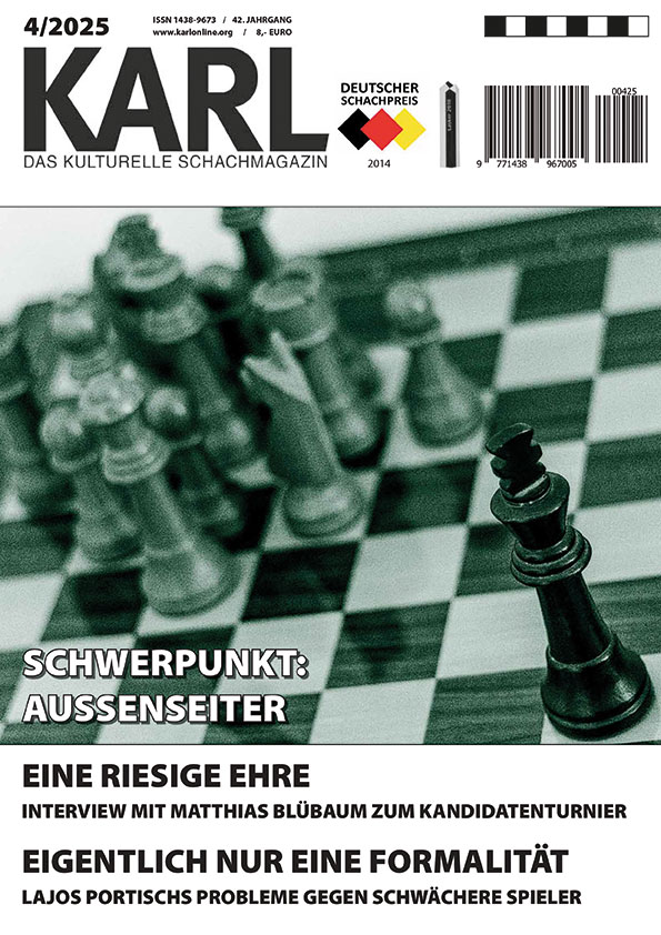 14.12.2025 – Pünktlich zu Weihnachten erscheint eine neue, sehr lesenswerte Karl-Ausgabe. Der Schwerpunkt wirft dabei einen Blick auf die Aussenseiter in der Welt und in der Schachwelt. So erzählt Michael Ehn in "Kopfstürme" unter anderem von einem Obdachlosen, der brillante Schachprobleme komponiert, und Matthias Blübaum spricht im Interview ausführlich und offen über Training, Geld und Erfolg und seine Rolle als Aussenseiter im Kandidatenturnier.