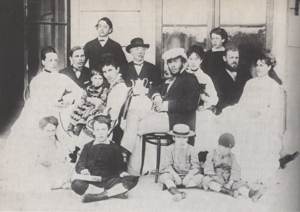 Die Familie von Meck um 1875. Die Baronin Nadeschda Filaretowna sitzt links und hält die jüngste Tochter Ljudmila (Milotschka) im Arm. Der Vater des Mädchens war in Wirklichkeit der links sitzenden Alexander Yolshin, Sekretär des Ehemanns der Baronin, des Ingenieurs Karl von Meck (Mitte mit dunklem Hut). Dies erfuhr Karl von Meck erst viel später durch die zweite Tochter Alexandra, und bekam daraufhin einen Herzinfarkt. Das Ehepaar von Meck hatte 18 Kinder, (zwischen 1848 und 1872), von denen 11 überlebten. Auf dem Foto in der Mitte mit weißem Hut, Wladimir von Meck, einer der Lieblingssöhne der Baronin.