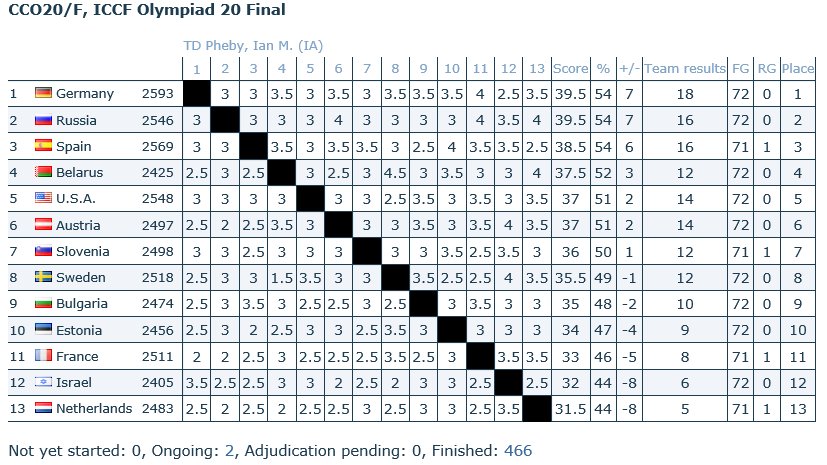 Zwei Partien laufen in der 20. Fernschach-Olympiade noch, doch das Deutsche Team hat schon alle seine 72 Partien beendet und steht als Goldmedaillen-Gewinner fest, neben den anderen Medaillengewinnern Russland und Spanien.