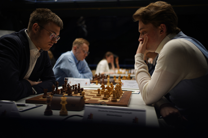 19.05.2025 – Als Deutschlands Nummer 1 ist Vincent Keymer klarer Favorit bei der Deutschen Meisterschaft in München und bislang wird er dieser Rolle eindrucksvoll gerecht. In Runde 4 gewann er überzeugend gegen Leonardo Costa und hat jetzt mit 4 Siegen aus 4 Partien bereits einen Punkt Vorsprung vor dem zweitplatzierten Matthias Blübaum. Auch im Frauenturnier überzeugt die Favoritin: Dinara Wagner startete ebenfalls mit 4 Siegen aus 4 Partien, und liegt aber nur einen Punkt vor Hanna Marie Klek, die mit 3 aus 4 alleinige Zweite ist. | Foto: Levian Raschke, DSB