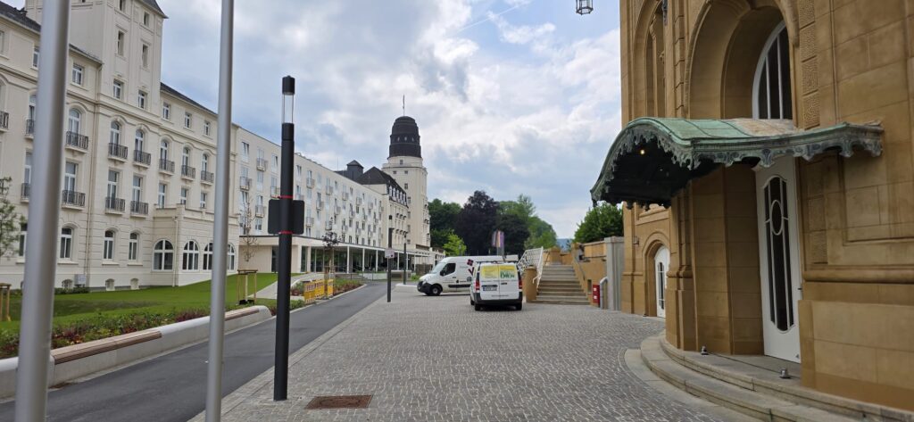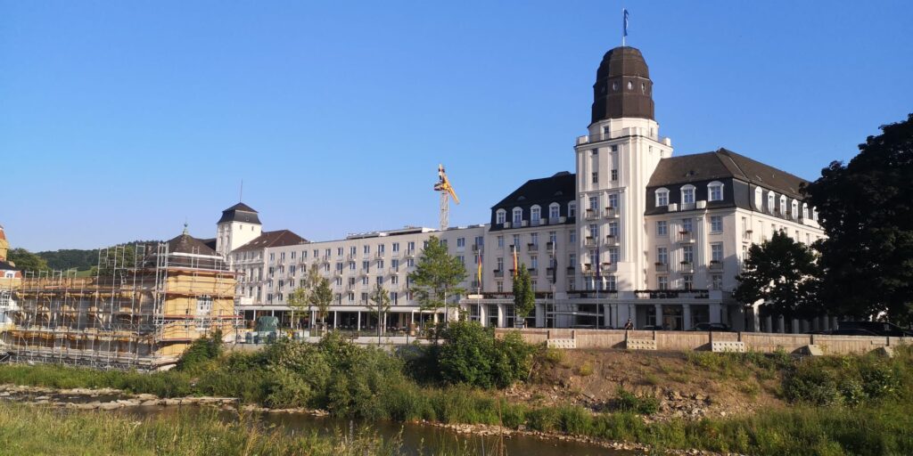 Bei der Anfahrt wollte mein Navi mich über eine nicht mehr existente Brücke lotsen. Die Stadt Bad Neuenahr-Ahrweiler wurde 2021 bei der verheerenden Flutkatastrophe im Ahrtal schwer getroffen, wobei zahlreiche Brücken, Straßen und Gebäude zerstört wurden und zahlreiche Menschen ums Leben kamen. Die Stadt gehört zu den Orten mit dem größten Schadensausmaß, heißt es. Inzwischen wurden weite Teile des Kurhauses, das den Schachspielern als Spielort diente, renoviert. Direkt neben dem Kurhaus führt die Ahr inzwischen nur wenig Wasser und man kann sich kaum vorstellen wie hoch das Wasser vor vier Jahren floss und das Steigenberger Hotel, auf der anderen Seite vom Kurhaus, im Erdgeschoss unter Wasser setzte. Im Hotel stand das Wasser bei 2,8 Meter und die Renovierungen einzelner Hotelteile dauern noch an. Inzwischen sieht alles wieder weitgehend schick aus und bot ein tolles Ambiente für ein Schachturnier.