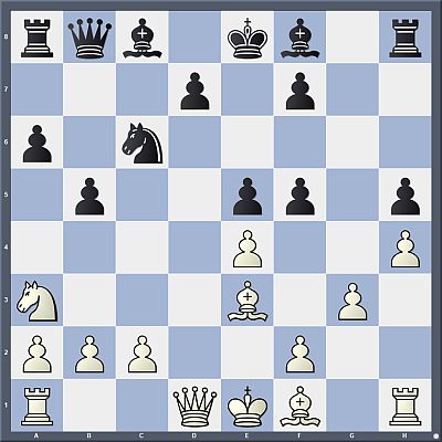 14.exf5 Lb7 15.Tg1 d5 Das schwarze Bauerndefizit wird kompensiert durch das mächtige Bauernzentrum + den weißen Springer auf a3.
