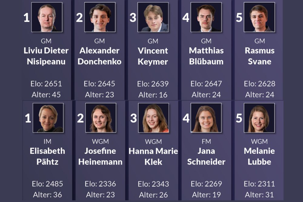 Deutschland geht im offenen Turnier von Startrang 9, im Frauenturnier von Position 7 ins Rennen. Die frischgebackene deutsche Nummer eins der Live-Weltrangliste Vincent Keymer wird erstmals in der A-Nationalmannschaft für Deutschland am Brett sitzen. Gespannt sein dürfen wir, ob er und Elisabeth Pähtz den Schwung der guten Resultate des am Sonntag beendeten Grand Swiss in Riga mitnehmen können. Unseren beiden jungen Mannschaften – Durchschnittsalter 26,4 bzw. 27 Jahre – ist auf jeden Fall zuzutrauen, den ein oder anderen nominell stärkeren Gegner zu ärgern.