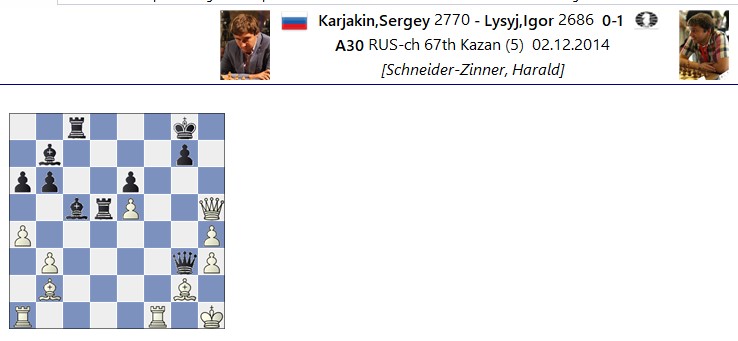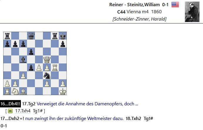 Nach der forcierten Zugfolge: 28…Dxg2+!! 29.Kxg2 Td2++ 30.Kg3 Tg2+ 31.Kf4 Tf8+ 32.Df7+ Txf7# entsteht die wunderschöne Schlussstellung.