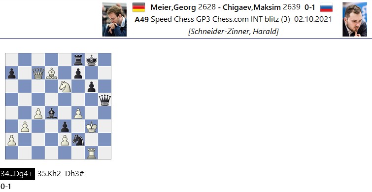 Nach kurzer Recherche in meiner Chessbase-Datenbank und einem Gegencheck mit meiner Schachengine würde ich sagen, dass mein Zug 34…Dh3#!, der vom Chessbase-System als falsch abgelehnt und verweigert wird, doch noch schneller ist als die Partiefortsetzung!