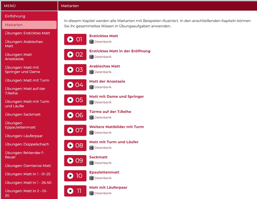Ein Vorteil dieses interaktiven Trainingskurses ist, dass bei den Mattarten zu jedem Thema eine Datenbank aufgerufen werden kann, die dann die in den Videos vorgestellten Mattmotive und alle dazugehörigen Übungsaufgaben übersichtlich auflistet.