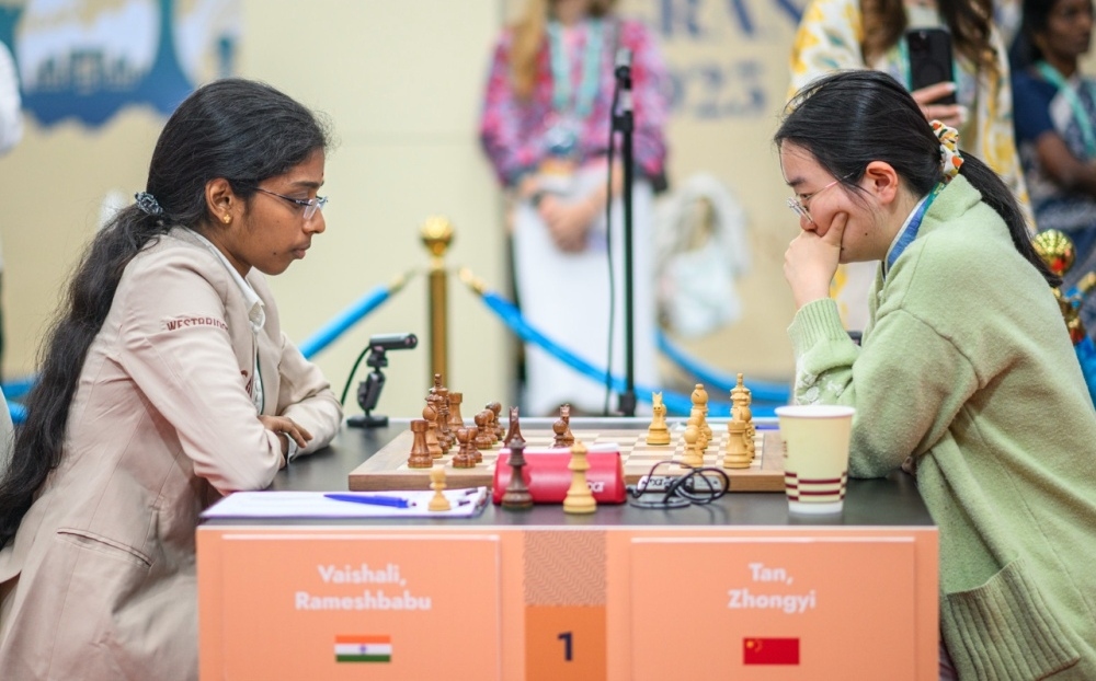 Vaishali Rameshbabu stand an Brett eins vor einer weitaus längeren Schlacht, die dreieinhalb Stunden dauerte, als sie mit Schwarz gegen die ehemalige Frauenweltmeisterin Tan Zhongyi spielte.
