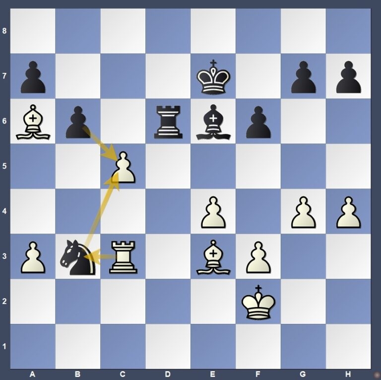 21…c3! 22.bc3 Nb5! Rückgewinnung des Bauern. Der Punkt ist, dass 23.c4 an 23…Nd4! scheitert, wodurch mindestens ein Qualitätsgewinn erzielt wird.