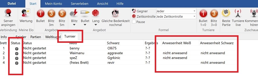 Wir hatten uns die Aufgabe gestellt, einen Mannschaftskampf mit allen Paarungen weitgehend automatisch zu starten. Dabei gab es einige Fallstricke beispielsweise in der Behandlung verspätet eingetroffener Spieler. An dieser Stelle haben wir versucht, die Bedienung viel eindeutiger und klarer zu gestalten, damit ein Wettkampfleiter, der oft auch selbst mitspielt, ohne großes Nachdenken verzögerte Partien starten kann und direkt sieht, wer noch nicht anwesend ist. Die Rolle des Wettkampfleiters ist durchaus anstrengend und dabei machen Unklarheiten oder technische Barrieren überhaupt keinen Spaß.