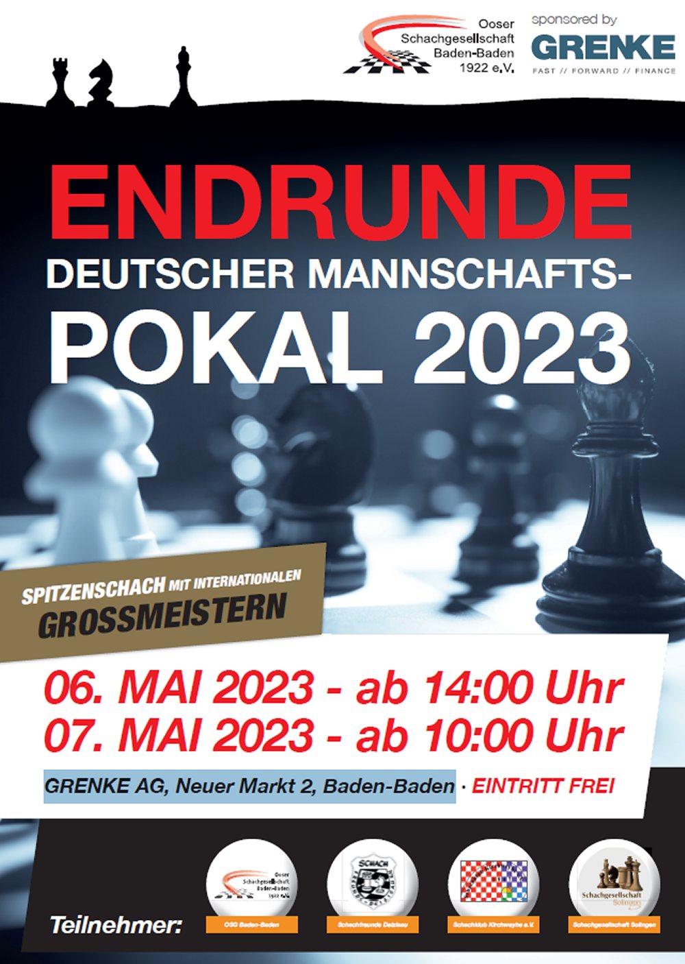 Am Samstag und Sonntag, dem 6. und 7. Mai, wird die Endrunde der Deutschen Pokal-Mannschaftsmeisterschaft (DPMM) ausgetragen. Gastgeber ist mit der OSG Baden-Baden der Meister der letzten Saison, der seinen Titel gegen die Schachfreunde Deizisau, die SG Solingen und den SK Kirchweyhe verteidigen will. Die Paarungen des Halbfinales werden kurzfristig vor Ort ausgelost. Gespielt wird im Hauptsitz der Grenke AG (Neuer Markt 2, Baden-Baden), dem Sponsor des Ausrichters OSG Baden-Baden. Zuschauer sind bei freiem Eintritt herzlich willkommen!