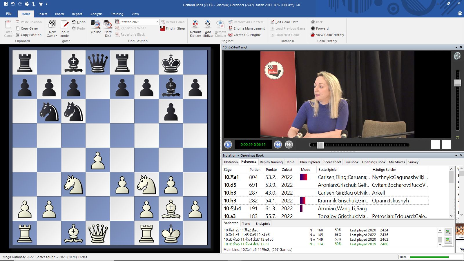 Nach den Zügen 1.d4 Sf6 2.c4 g6 3.Sf3 Lg7 4.g3 d5 5.cxd5 Sxd5 6.Lg2 Sb6 7.Sc3 Sc6 8.e3 0–0 9.0–0 Te8 schlägt Elisabeth Pähtz vor, mit 10.h3 dem schwarzen Gegenspiel einen Strich durch die Rechnung zu machen. Ein Blick mit ChessBase 16 in die Referenzdatenbank zeigt, dass es sich hierbei um eine Nebenvariante handelt, die aber ganz offensichtlich im Kommen ist!