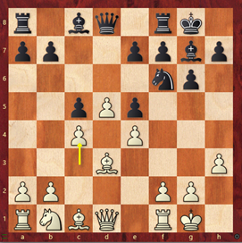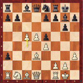 Hier endet die Variante mit klarem Vorteil für Weiß! Das Zentrum mit den Bauern e4, d5 und c5 engt die gegnerischen Figuren enorm ein und verhindert jede Form von Aktivität. Im nächsten Zug kann der Bauer a3 geschlagen und dann weiter am Vorrücken der Bauern gearbeitet werden.