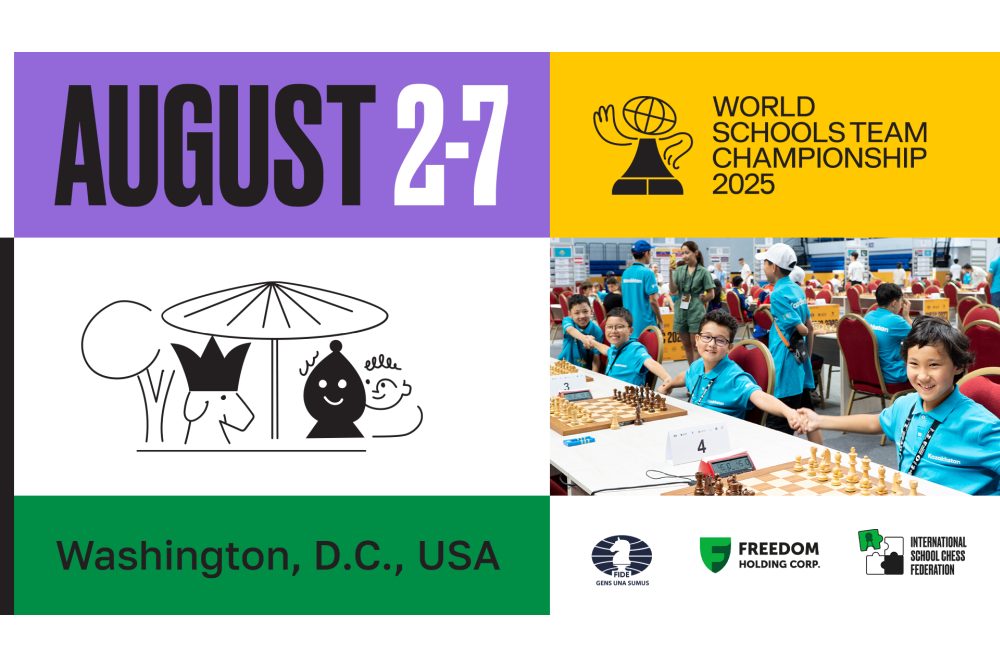 Die FIDE und die International School Chess Federation (ISCF) laden alle FIDE-Mitgliedsverbände zur Teilnahme an der Weltmeisterschaft für Schulmannschaften 2025 (WSTC) ein. Der Wettbewerb findet vom 2. August (Ankunft) bis zum 7. August (Abreise) 2025 in Washington, D.C./Alexandria, USA, statt.