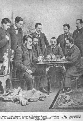 1901 Moskau, 2. Allrussische Meisterschaft: Von Links: Stehend: Dus-Chotimirsky, K.V. Rosenkrantz, D.M. Janowski, S.V. Lebedev, V.N. Kulomzin; Sitzend: E. S. Schiffers, S.V. Antushev, V.I. Tabunshchikov, M.I. Tschigorin