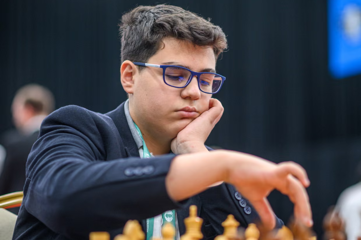 Yagiz Kaan Erdogmus beim FIDE Grand Swiss 2025, wo er mit 6 von 11 Punkten den 28. Platz gegen starke Konkurrenz belegte – in der achten Runde gelang ihm ein Überraschungssieg gegen Levon Aronian. | Foto: FIDE / Michal Walusza