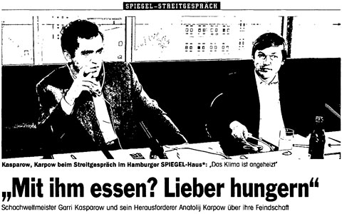 Der letzte Punkt war besonders lehrreich und ich möchte Ihnen ein Beispiel geben, wie das praktisch aussieht. 1990 lud Harenberg Kasparov und Karpov, deren Feindschaft damals einen Höhepunkt erreicht hatte, zu einem Streitgespräch im Spiegel ein. Leider waren die beiden nicht in der Lage, eine akzeptable Diskussion von Angesicht zu Angesicht zu führen und das Ergebnis war ziemlich enttäuschend. Im Einzelgespräch waren die Weltmeister jedoch sehr viel entgegenkommender.