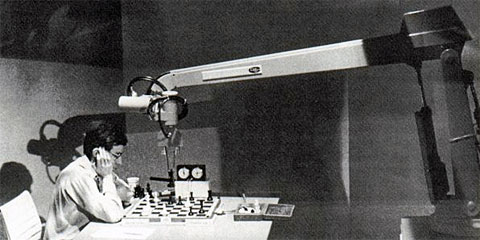 1979 war ich ein junger Wissenschaftsjournalist und schrieb und produzierte Dokumentationen für das ZDF. Nach vielen interessanten Projekten entdeckte ich, dass Computer (ob Sie es glauben oder nicht) Schach spielen konnten. Wir drehten eine Dokumentation über dieses Thema und in einem Teil dieser Dokumentation spielte IM David Levy in unserem Fernsehstudio in Hamburg gegen das Computerprogramm 4.8. Die Züge führte ein Roboterarm aus, der direkt von einem riesigen Mainframe-Rechner kontrolliert wurde, der in Minneapolis, in den USA, stand.
