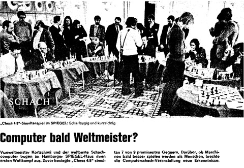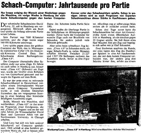Bald nach der Levy-Partie organisierte Der Spiegel selbst ein Match, in dem Viktor Kortschnoi gegen Chess 4.8 antrat. Bericht (siehe Foto unten) und Partie findet man im Spiegel-Archiv.