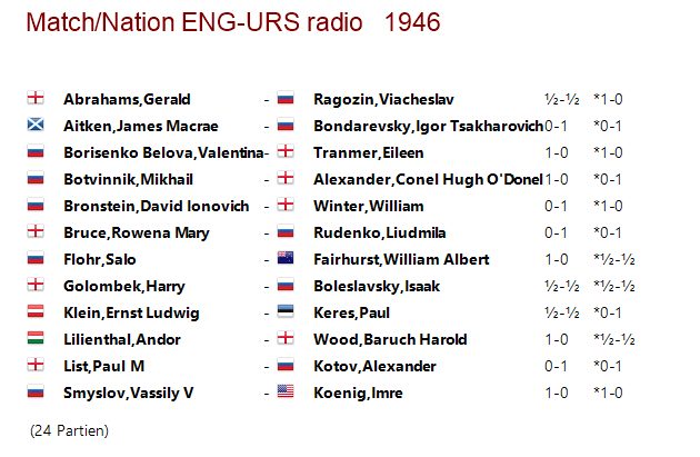 Bald nach Ende des Krieges wurden zwischen den siegreichen Alliierten so genannte Radiomatches im Schach ausgetragen, bei denen die Züge per Funkt übertragen wurden. Lydmila Rudenko spielte 1946 den Radiowettkampf gegen eine englische Auswahl mit. Neben zehn Männern traten auch je zwei Frauen an.