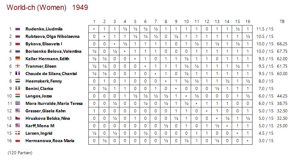 Denn tatsächlich verlor Rudenko nun keine weitere Partie mehr, besiegte mit Rubtsova und Bykova ihre engsten Konkurrentinnen aus dem eigene Land und wurde im Alter von immerhin schon 45 Jahren mit einer Ausbeute von 11,5/15 Punkten die zweite Schachweltmeisterin der Geschichte. Ihre Landsfrauen belegten die folgenden Plätze. Die Deutsche Edith Keller-Herrmann wurde auf Platz fünf die beste Nicht-Sowjetspielerin.