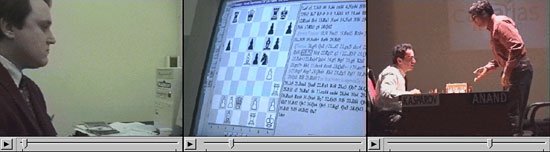 Yury Dokhoian überprüft die Variante 20.g4 mit Fritz während der Partie, Kasparov und Anand analysieren nach der sechsstündigen Partie (Screenshot des Videos aus CBM 56)