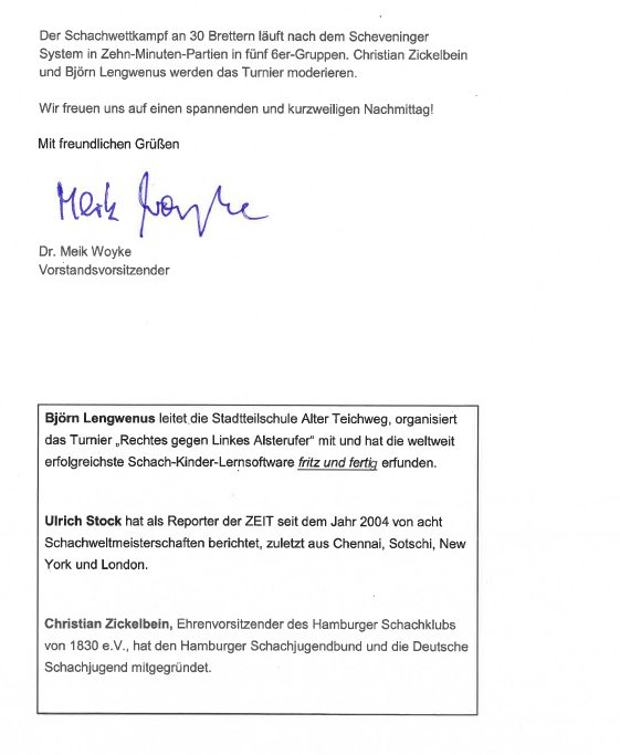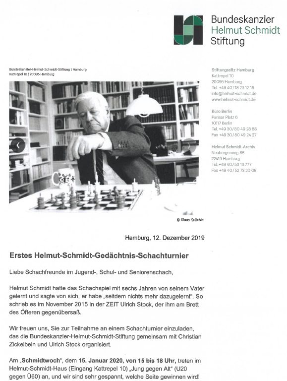 "Jung gegen Alt" lautet das Motto des ersten Helmut Schmidt Gedenkturniers. 30 junge Spieler Ü 20 treffen auf 30 erfahrene Spieler Ü 60. Gespielt wird in Gruppen zu je sechs Spieler und dort im Scheveninger System. Am Schluss wird zusammen gezählt. Unter den Teilnehmern befindet sich einige bekannte Gesichter und Namen, zum Beispiel die Deutsche U10- Mädchenmeisterin Allissa Wartenberg, Fritz Fegebank, Vater der bekannten Politikerin und im Hamburger Schach ebenso bekannt, und nicht zuletzt Luis Engel.