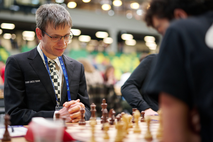 Ein Routinier durchschreitet die Spielhalle: Vasyl Ivanchuk (UKR/2621) musste gegen IM Pawel Sowinski (POL/2421) auch bereits einen halben Punkt abgeben.| Foto: Veranstalter