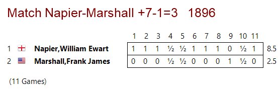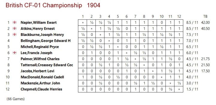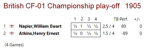 Vor dieser Begegnung hatten Napier und Atkins zweimal gegeneinander gespielt - einmal in Hannover 1902 und einmal bei der Britischen Meisterschaft. Da beide Partien unentschieden endeten, versprach das Finale spannend zu werden. Und so war es auch, wobei Napier in der zweiten Partie den einzigen Sieg errang und so der erste britische Schachmeister wurde. Atkins wurde in der Folge allerdings einer der beherrschenden Spieler in der Geschichte der britischen Meisterschaften und gewann den Titel neun Mal.
