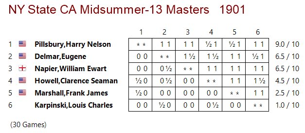 Der Schönheitspreis des Turniers ging an Pillsbury für seine Partie gegen Lasker, doch Napier erhielt für seine Partie gegen John Finan Barry den zweiten Schönheitspreis. Doch die vielleicht bemerkenswerte Partie des Turniers war der Kampf zwischen Napier und Lasker. Die Partie war äußerst komplex und wurde von Generationen von Kommentatoren analysiert und unterschiedlich bewertet. Moderne Computeranalysen haben Fehler entdeckt, aber Lasker und Napier haben nach menschlichen Ermessen ausgezeichnet gespielt.