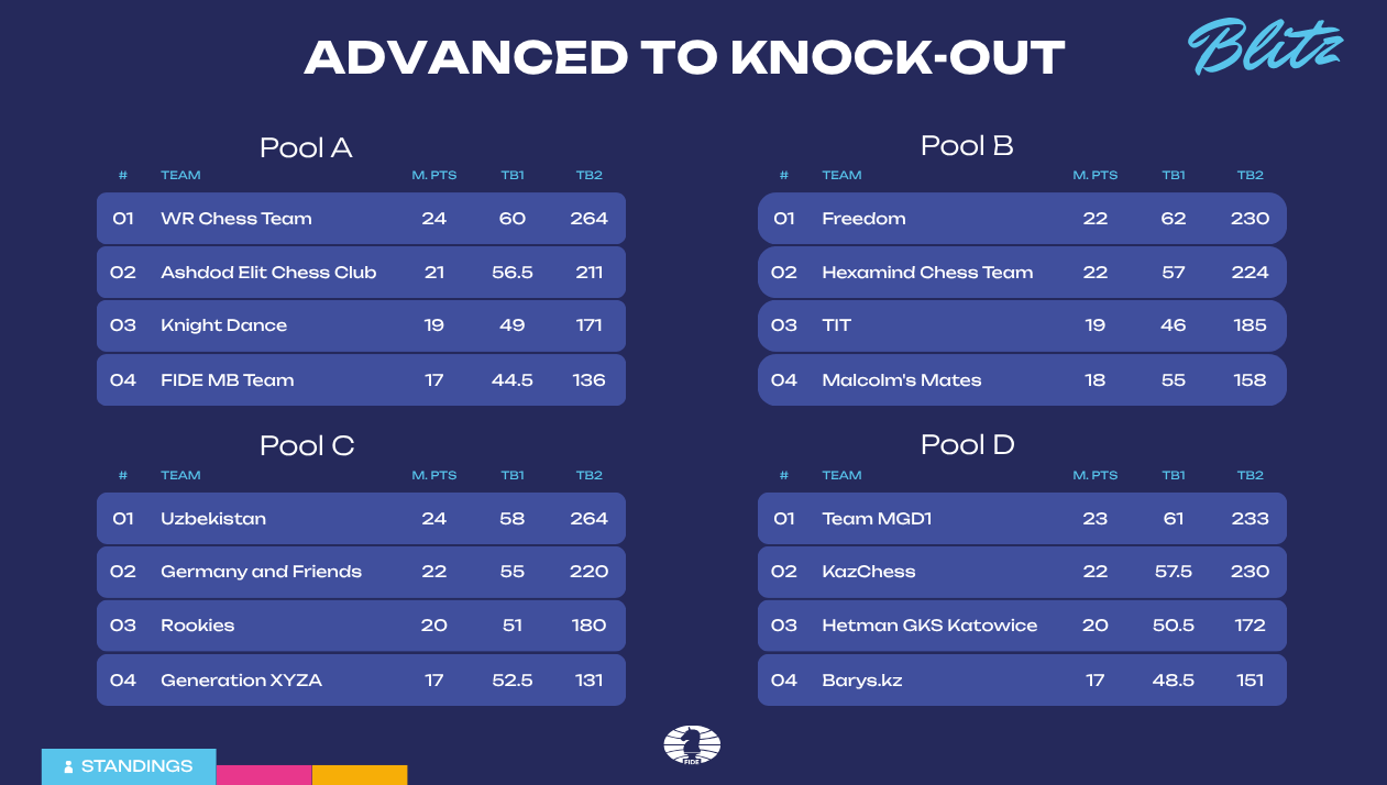 Nach Abschluss der Pool-Phase liegt der Fokus nun auf den K.-o.-Runden am Sonntag, in denen die 16 Qualifikanten um den Titel des FIDE-Blitzschachweltmeisters 2025 kämpfen werden.