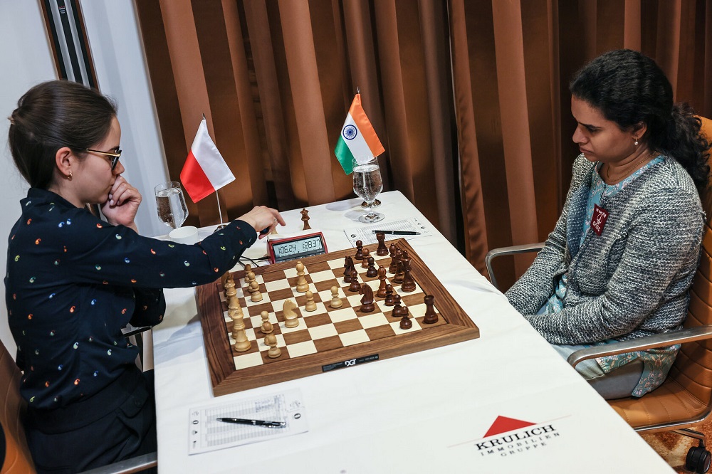 Alina Kashlinskaya verlor gegen Humpy Koneru, als sie in einem schlechteren Läuferendspiel unter Druck stand und die richtige Verteidigung nicht fand. Humpy liegt nun zwischen Kosteniuk und dem Duo Dzagnidze/Pähtz auf Platz zwei der Tabelle.