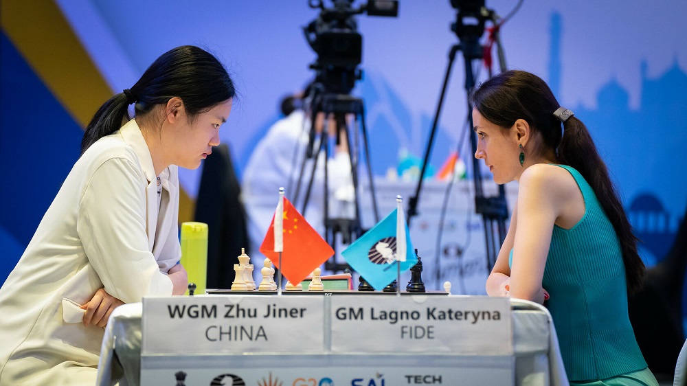 31.03.2023 – In der am Donnerstag gespielten 5. Runde des Grand Prix in Neu Delhi hat Zhu Jiner gegen Kateryna Lagno gewonnen. Mit einem Score von 3,5/5 besetzt die Chinesin zunächst alleine den ersten Tabellenplatz, doch ableiten kann man daraus noch nichts: Es gibt auch Konkurrentinnen, die nur deshalb zurückliegen, weil sie erst vier oder gar nur drei Partien gespielt haben. | Fotos: Ismael Nieto / FIDE