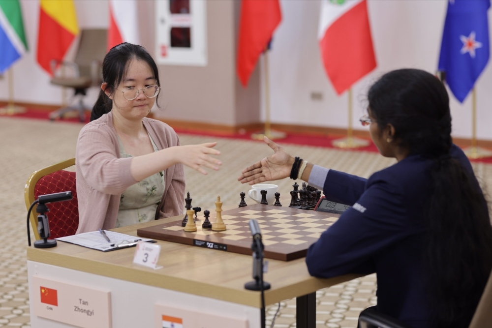 Im Match zwischen Tan Zhongyi und Vaishali war die erste Partie remis ausgegangen. In der zweiten Partie eröffnete Tah Zhongyi mit Weiß mit einem Katalanischen Gambit und erhielt für den geopferten Bauern eine starke Initiative. Bei der Verwertung ihres positionellen Vorteils fand die Ex-Weltmeisterin nicht immer den besten Zug, erreichte aber ein sehr vorteilhaftes Endspiel, das sie zum Partiegewinn verwertete.