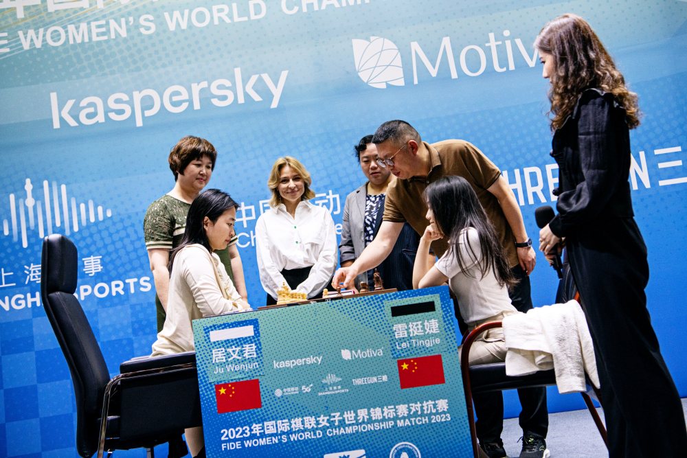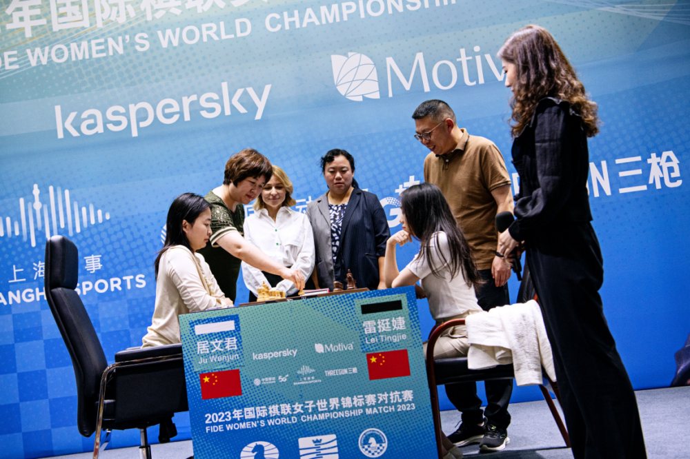 Die sechste Partie der FIDE-Frauenweltmeisterschaft wurde von Zhang Yi, Direktor der Abteilung für Jugendsport und Bildung der Shanghaier Sportverwaltung, und Ma Jiabin, Direktor des Jing'an-Distrikts der Shanghaier Sportverwaltung, mit dem symbolische ersten Zug eröffnet.