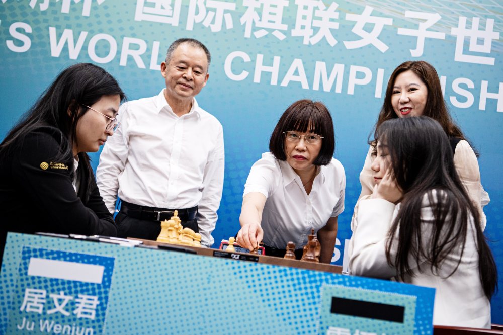 In der zehnten Partie des Wettkampfes um die Weltmeisterschaft machte Titelverteidigerin Ju Wenjun ein neues Fass auf und eröffnete mit 1.Sf3. Nach Lei Tingies Antwortzug 1...Sf6, nicht die ungewöhnlichste Antwort, verfiel Ju Wenjun in längeres Nachdenken.