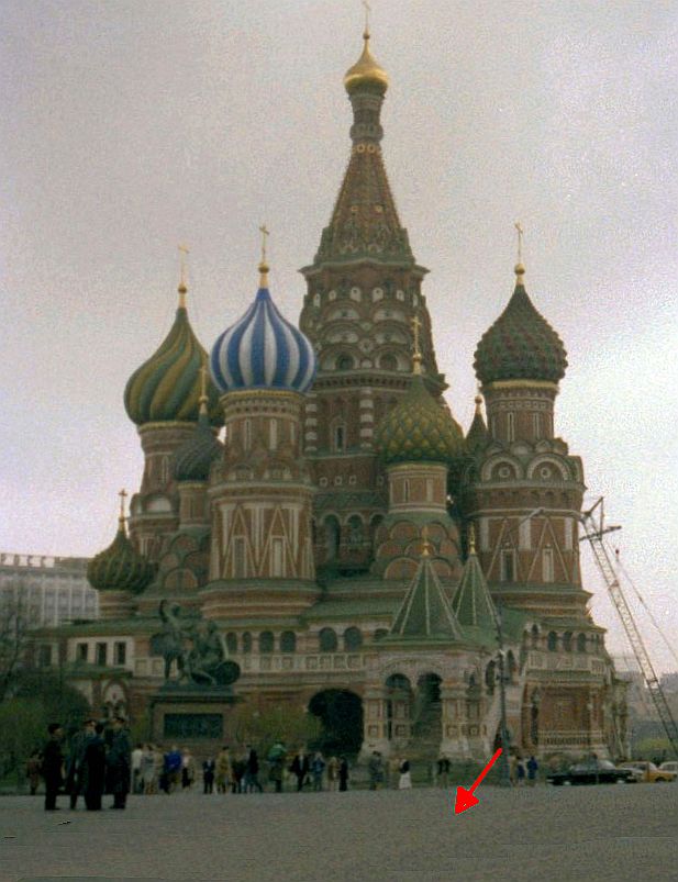 Bevor wir nach Moskau aufbrachen, rief ich Ken an und sagte: „Hör zu, sie werden uns im selben Hotel unterbringen, aber wenn sie das Hotel wechseln, hinterlässt du eine Nachricht, wo du bist, damit wir uns gegenseitig finden können. Wenn alle Stricke reißen, dann treffen gehen wir am nächsten Morgen um 10 Uhr auf den Roten Platz und treffen uns dort vor einer Kathedrale, der Basilius-Kathedrale, die wie eine Hochzeitstorte aussieht [roter Pfeil im Bild].
