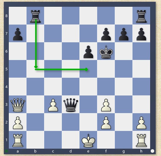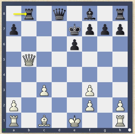 In dieser Stellung (nach 14.bxc3 Tb8) sollte Weiß keinesfalls das einladende 15.La3+ spielen, denn nach 15...Kf6 16.Da4 Lxa3 17.Dxa3 Dd3! steht Weiß aufgrund der Drohung ...Tb5 und ...Te5+ quasi auf Verlust.